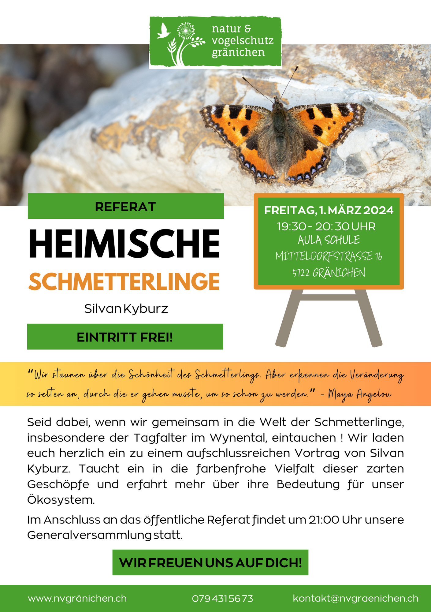 Seid dabei, wenn wir gemeinsam in die Welt der Schmetterlinge, insbesondere der Tagfalter im Wynental, eintauchen! Wir laden euch herzlich ein zu einem aufschlussreichen Vortrag von Silvan Kyburz. Taucht ein in die farbenfrohe Vielfalt dieser zarten Geschöpfe und erfahrt mehr über ihre Bedeutung für unser Ökosystem.